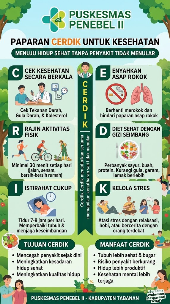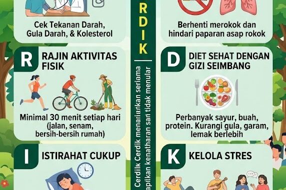 CERDIK adalah program perilaku hidup sehat yang bertujuan mencegah penyakit, terutama penyakit tidak menular seperti diabetes, hipertensi, dan jantung. CERDIK mengajak masyarakat untuk lebih peduli... Read More
